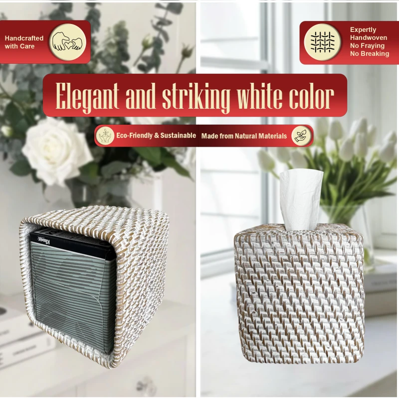 - Eco-Friendly Craft with a Human Touch: Made from natural materials like rattan, bamboo, each wooden tissue box cover or bamboo tissue box cover helps reduce plastic use in your home. Behind every wood tissue box cover is the story of artisans who carefully harvest bamboo and rattan by hand — a process that can cause painful scratches and cuts on their skin. Yet, they continue with dedication, passing down their skills from generation to generation. Choosing this rattan box or pairing it with a rattan toilet paper holder means you're not just organizing with elegance, but also supporting eco-conscious craftsmanship and honoring those who shape beauty with care.