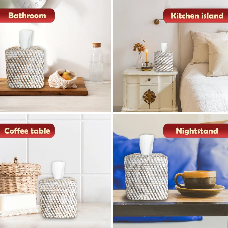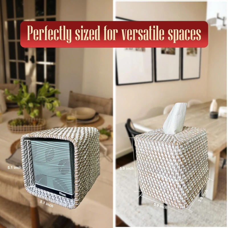 - Perfect Fit for Boho, Farmhouse & Vintage Decor Lovers: Designed for those who cherish details. This decorative rattan tissue box cover is treated with a unique color that you'll be hard-pressed to find anywhere else, blends seamlessly into any boho, vintage, or farmhouse-inspired interior.After a long day of work, there's nothing like returning to a space that feels calming. This boho tissue box cover helps create a warm, atmosphere that welcomes you home. It's a thoughtful touch for anyone seeking a farmhouse tissue box cover or the timeless charm of a vintage tissue box cover.