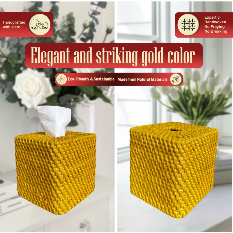 - Premium Fit & Elegant Finish: Sized at 5.7 x 5.7 x 5.9 inches, this rattan box fits most cube tissues—please measure carefully before purchase. Coated with a paint smooth, natural finish for a refined look, it’s available in elegant beige and a bold gold tissue box holder. Use it on any toilet top cover or shelf. Easy to clean with a damp cloth and best kept in dry, well-ventilated spaces to maintain its beauty.