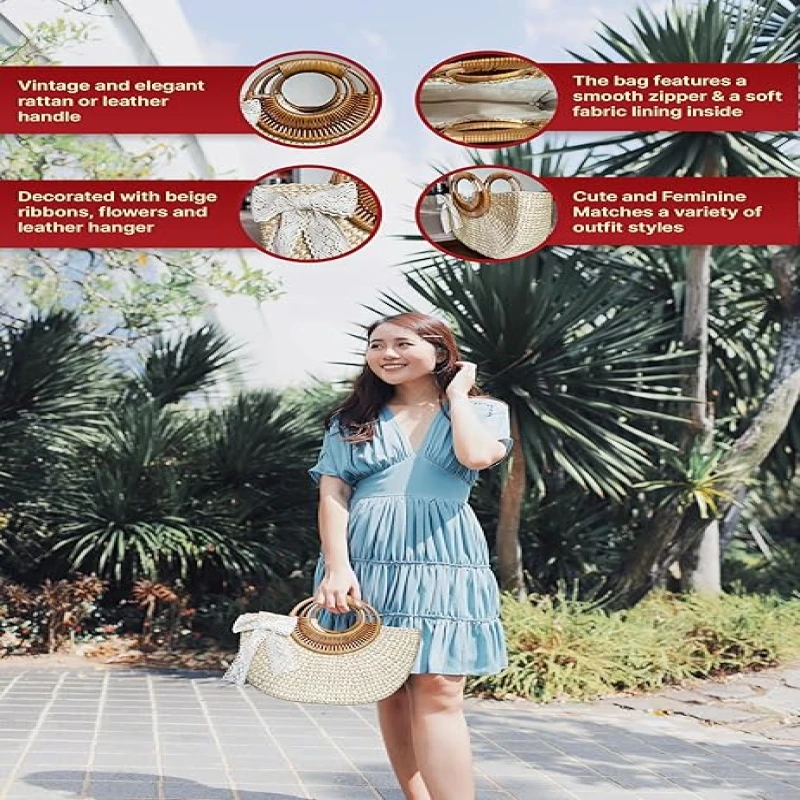 - TRULY UNIQUE – CRAFTED TO IMPRESS: Handwoven from natural water hyacinth with rattan handles, this handbag features a fabric lining, beige bow, rose detail, and an extra red pouch for travel. A small beach bag that’s new, bold, and beautiful. It’s the ultimate packable beach bag, a true woven bag for women and standout rattan bag you won’t find anywhere else.
