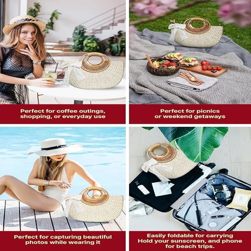 - SUMMER BAG & CUTE BEACH BAG: This pretty straw bag features a soft beige bow or leather hanger that accentuates your feminine side and easily pairs with a boho or vintage look. Its size fits sunscreen, sunglasses, phone, and more. You will have cute pictures with this bag on your vacation. Also perfect as a gift for loved ones. Great choice among straw bags for women 2025 and vacation handbags.