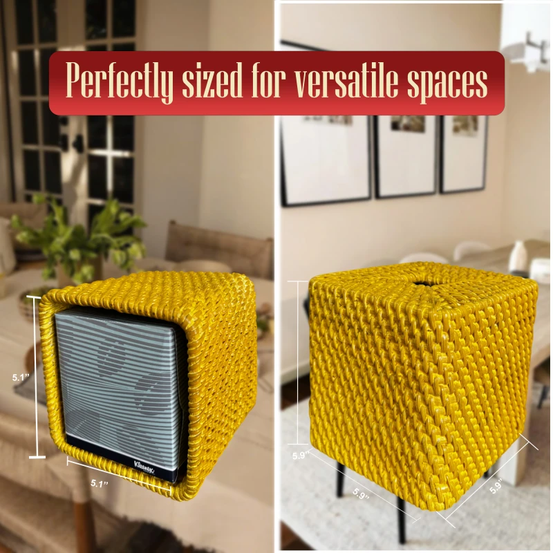 - Premium Fit & Elegant Finish: Sized at 5.7 x 5.7 x 5.9 inches, this rattan box fits most cube tissues—please measure carefully before purchase. Coated with a paint smooth, natural finish for a refined look, it’s available in elegant beige and a bold gold tissue box holder. Use it on any toilet top cover or shelf. Easy to clean with a damp cloth and best kept in dry, well-ventilated spaces to maintain its beauty.