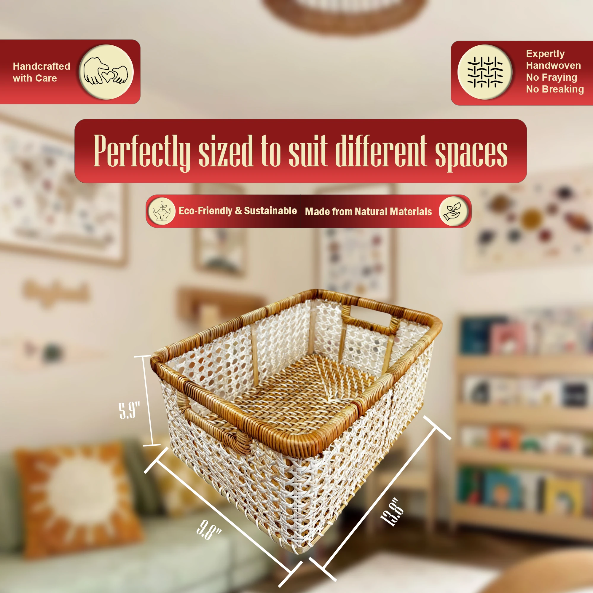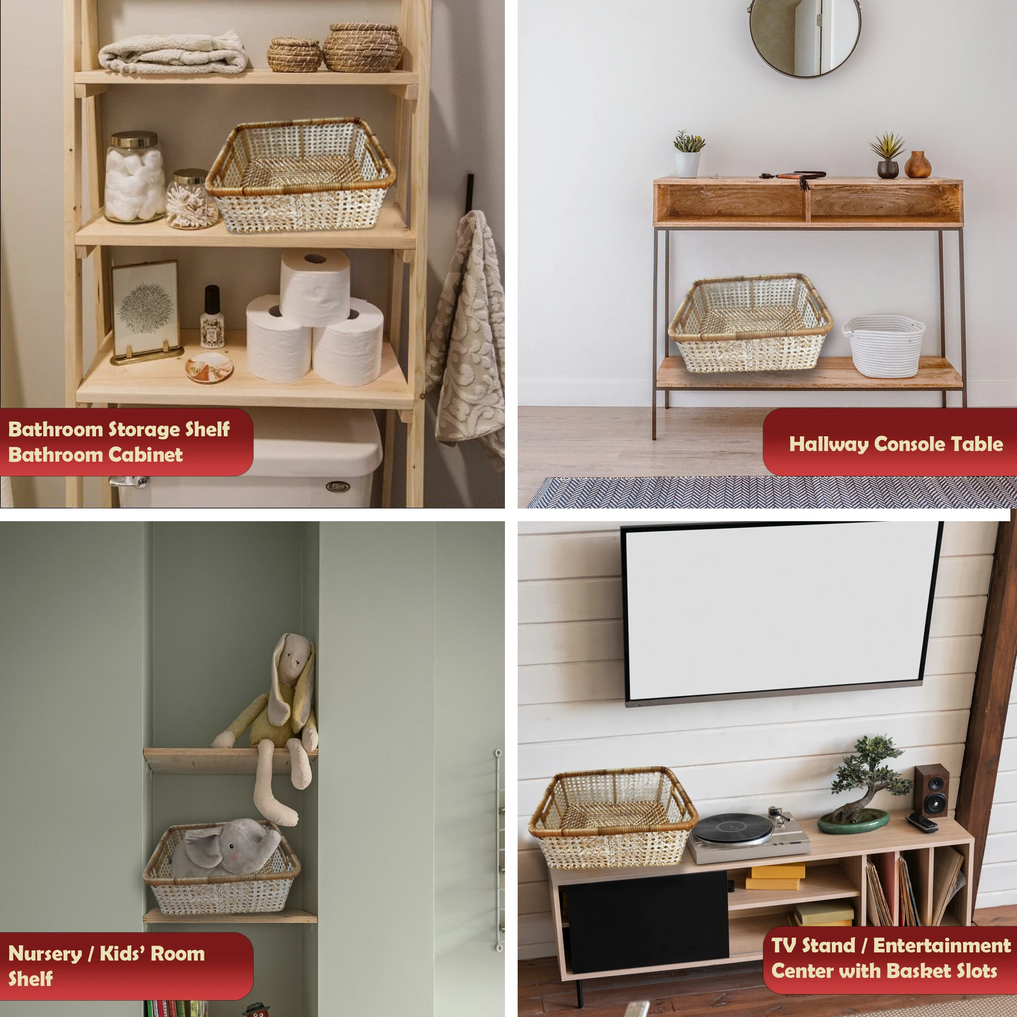 - A Perfect Match for Boho & Vintage Whether you're embracing the cozy charm of Rustic style, or the earthy textures of Boho-inspired homes, this woven storage basket blends effortlessly into any decor. Its handcrafted beauty makes it more than a wicker storage bin. Ideal as a wicker basket for shelf, a cube basket for storage shelves, or even a decor basket for entryway tables or bedrooms. It's perfect for everything from bathroom organization to living room blanket storage, bookshelf baskets. With its handwoven water hyacinth texture and soft tones, this wicker organizer elevates your space — the ultimate choice for anyone curating a farmhouse, vintage, or boho home.